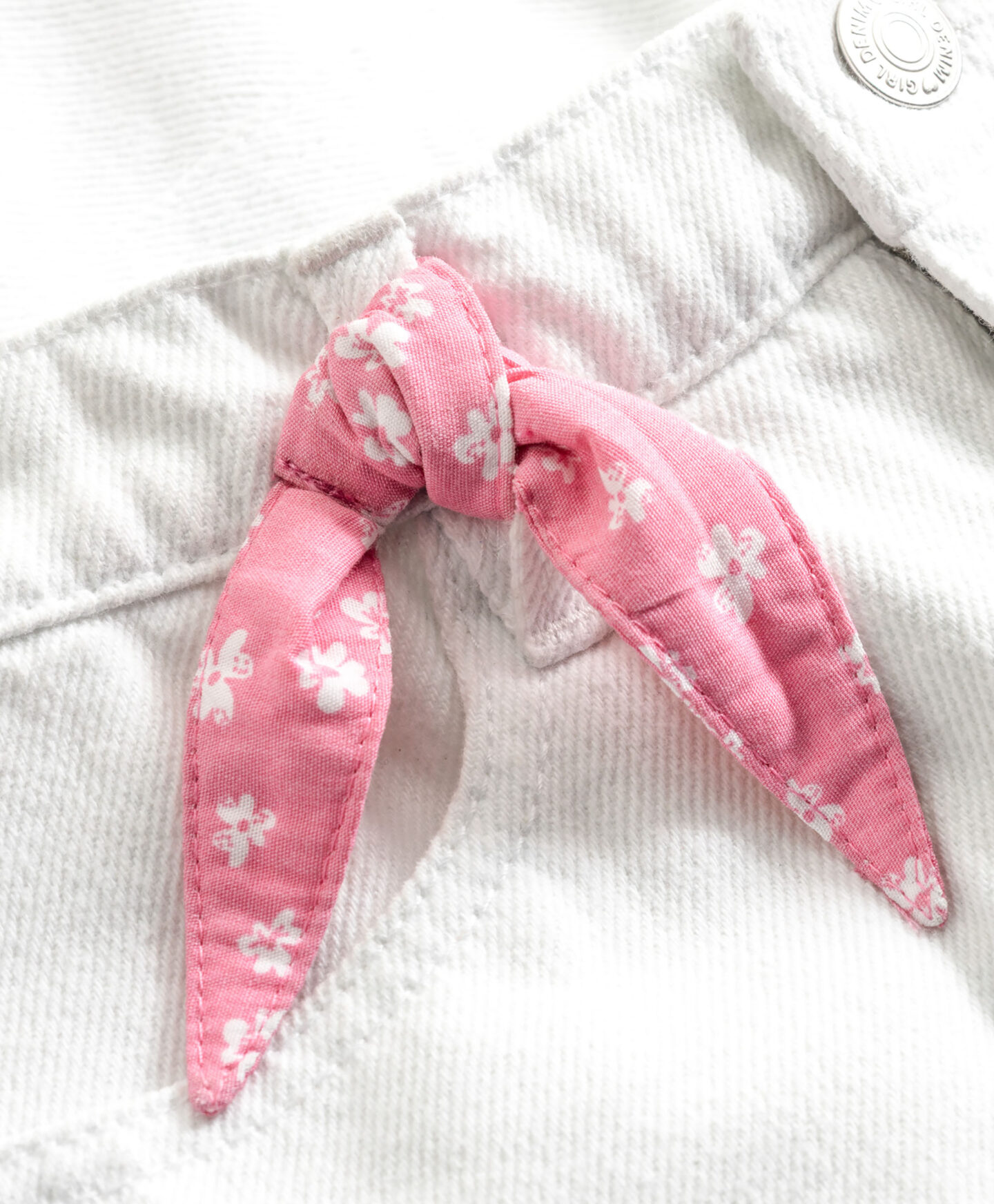 El pantalón corto vaquero es uno de los imprescindibles del verano. El denim blanco resulta fácil de combinar con colores y estampados diferentes. El corte cómodo permite moverse con libertad en cualquier aventura veraniega y la cintura con botón facilita un ajuste perfecto. Incluye un pañuelo rosa que aporta un detalle decorativo ideal para anudar en forma de lazo.