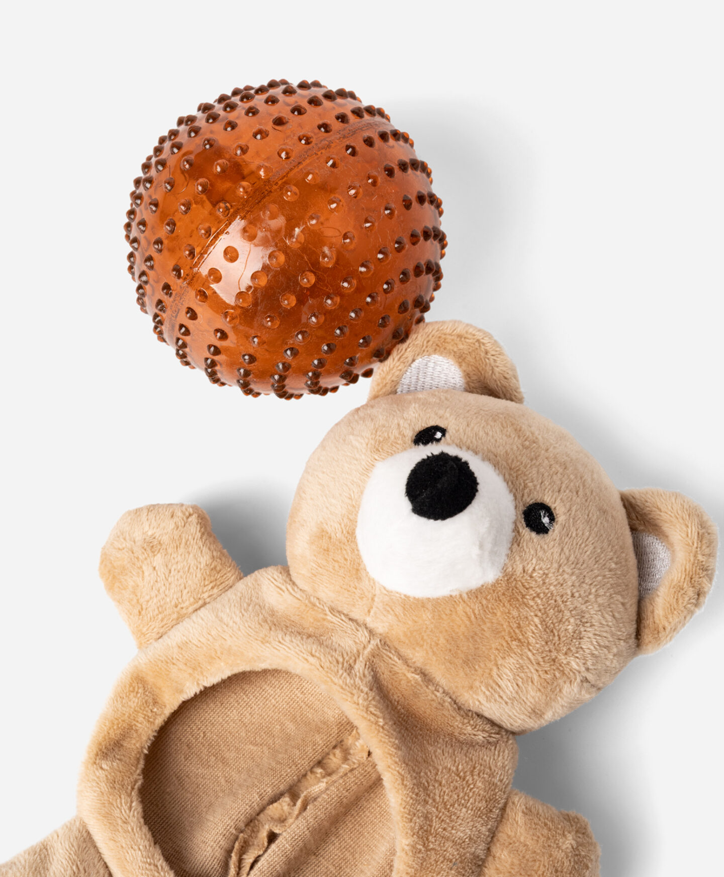 Juguete de peluche beige para perro con pelota, perfecto para juegos interactivos. Suave al tacto y resistente para mayor seguridad. La pelota integrada fomenta el movimiento y el entretenimiento.