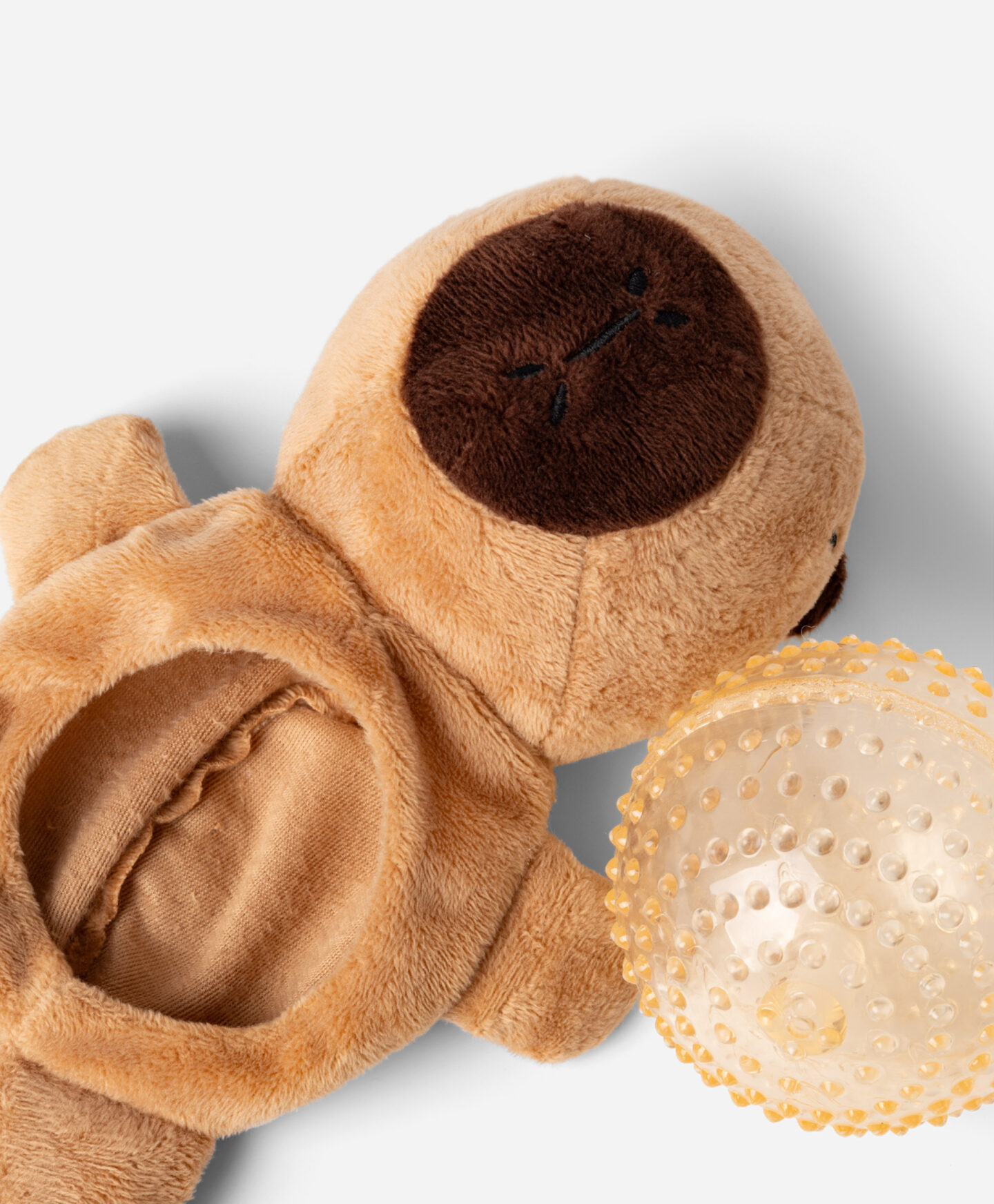 Juguete de peluche marrón para perro con pelota, ideal para quienes disfrutan de juguetes suaves e interactivos. Fabricado con material blando y resistente para un juego seguro. La pelota añade diversión extra y estimula la actividad.
