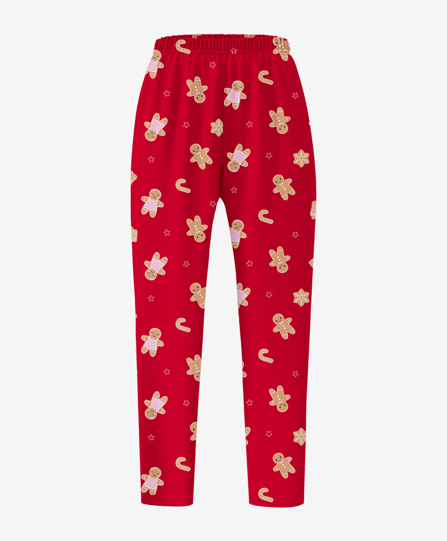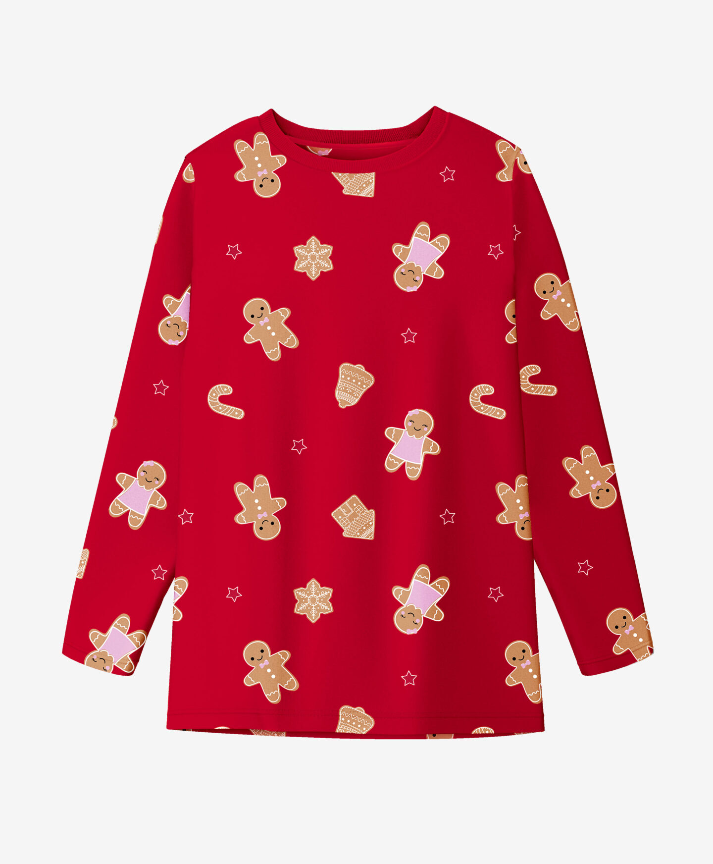 El pijama con estampado 100% algodón tiene un divertido diseño de muñecos de jengibre. El conjunto incluye camiseta de manga larga y pantalón, ideal para las noches más frescas. Su tejido suave y transpirable ofrece comodidad y calidez cada noche. Una opción perfecta para quienes adoran el ambiente navideño.