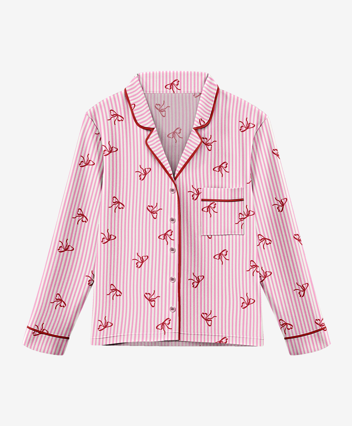 El pijama con estampado de lazos está formado por una camisa con cuello y botones rosas combinada con un pantalón a juego. Es suave, cálido y muy agradable al tacto, ideal para relajarse o leer antes de dormir. También es un detalle perfecto para regalar.