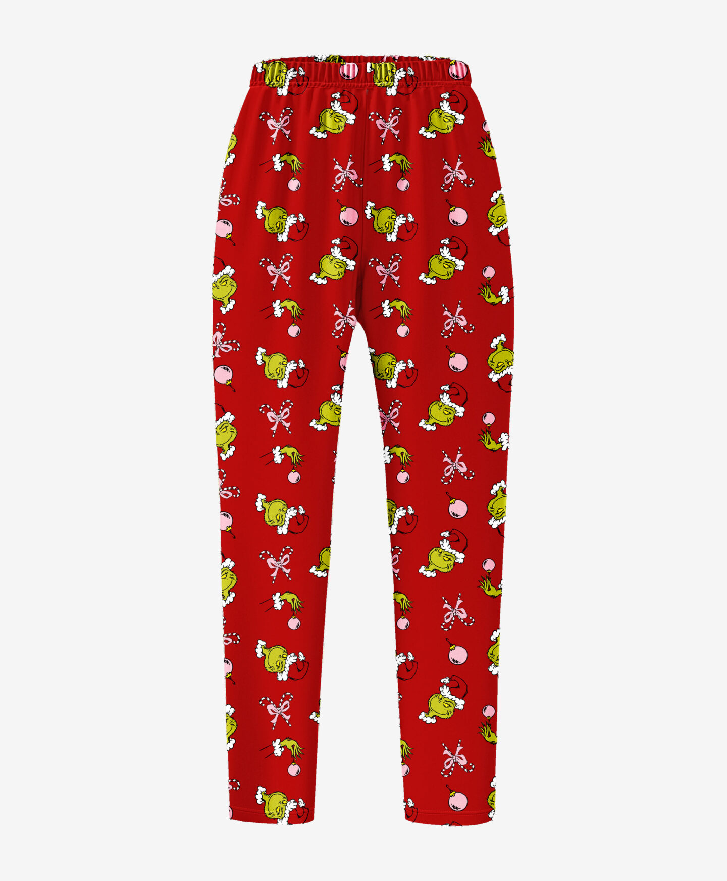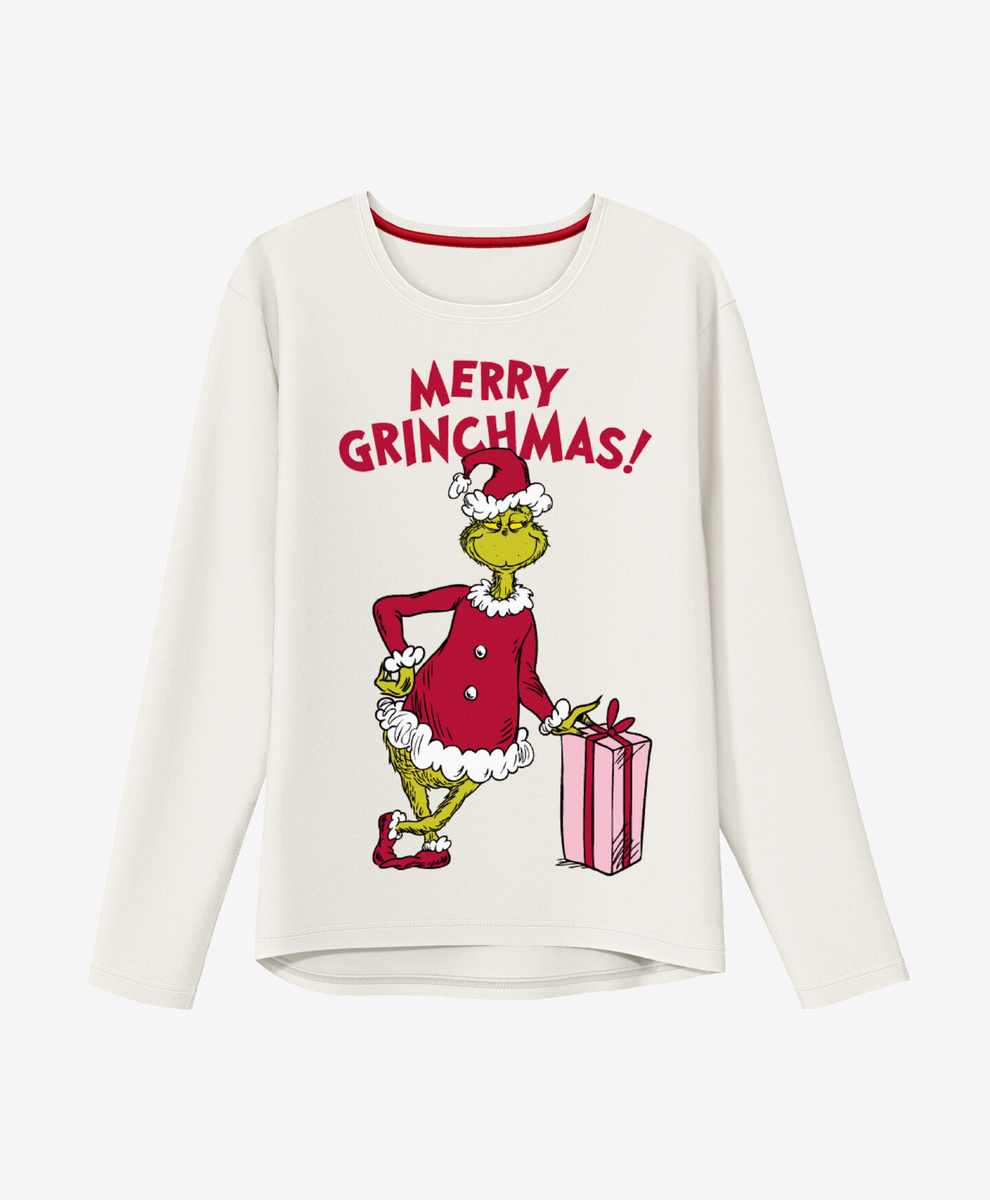 El pijama de Grinch, 100% algodón, combina camiseta de manga larga con el personaje y pantalón de estampado festivo. Un pijama cómodo y suave, ideal para noches frías y como regalo divertido.