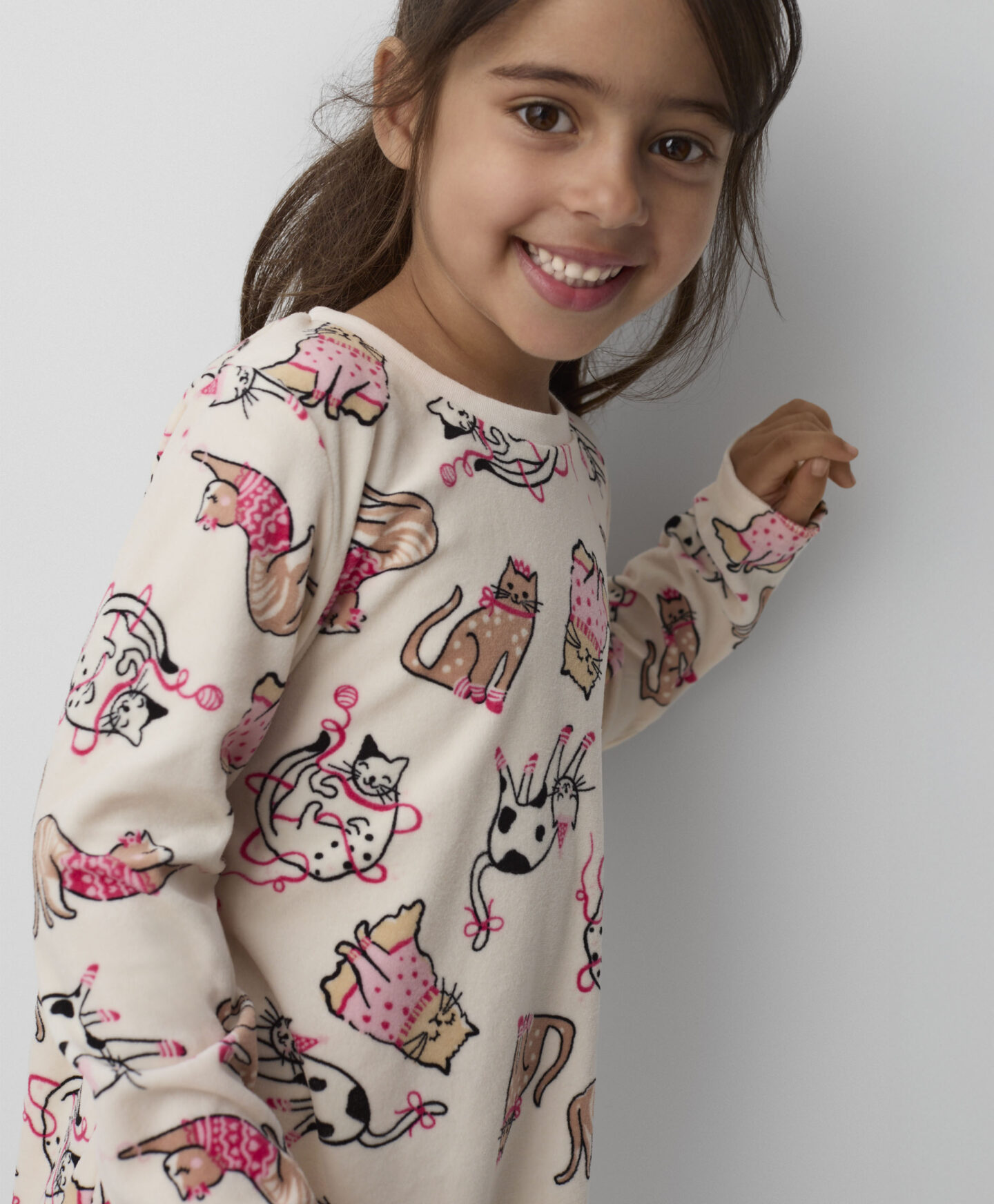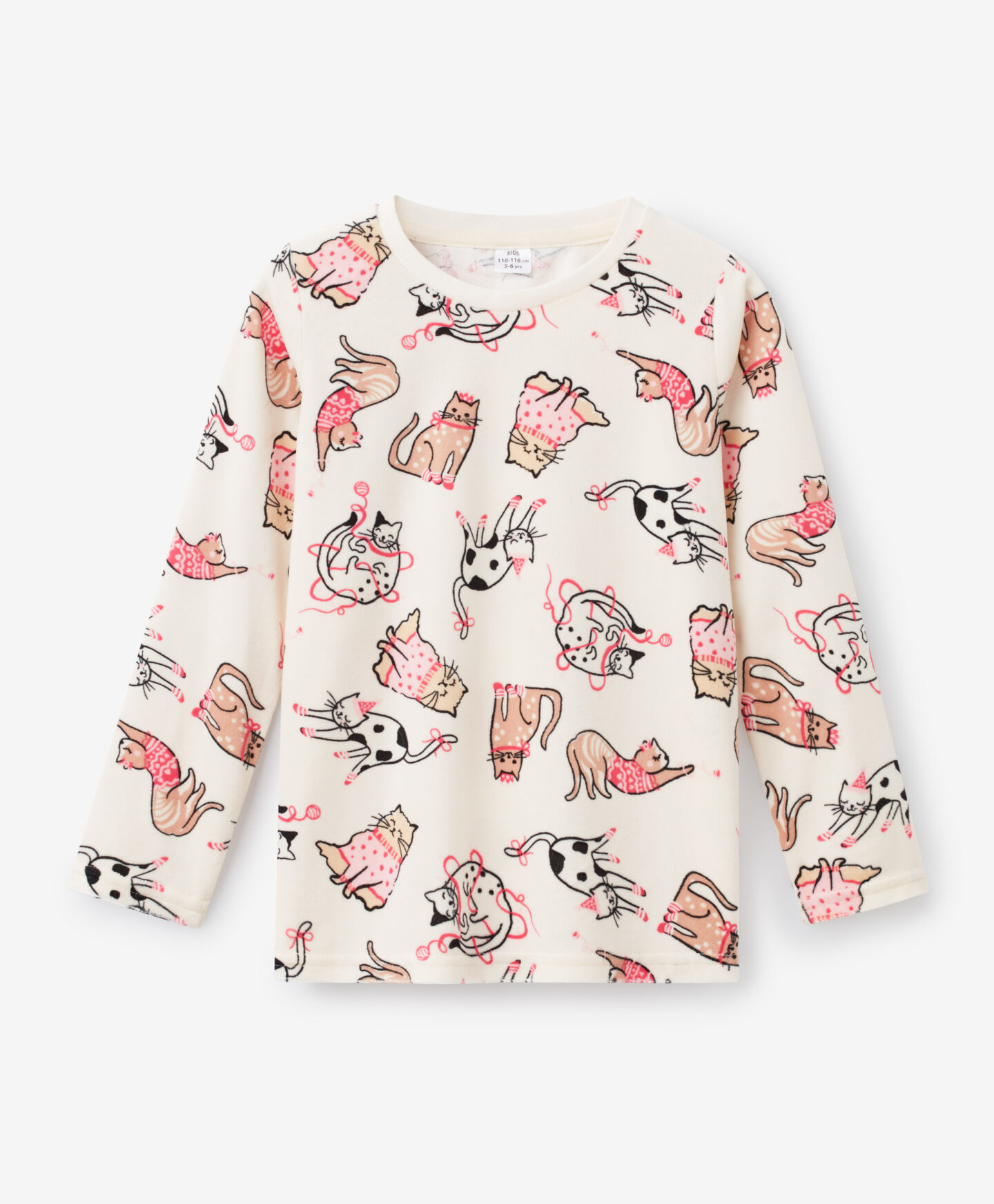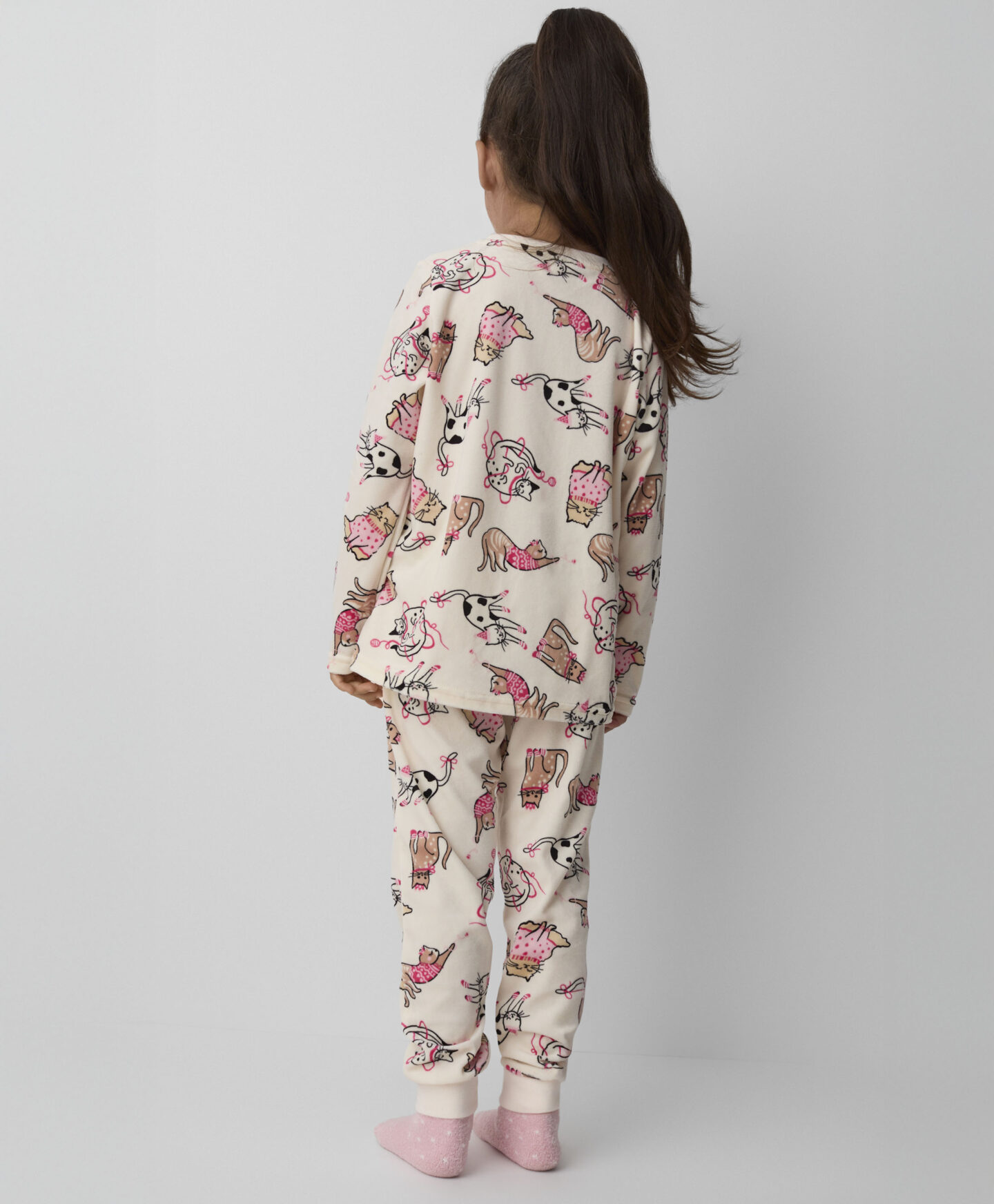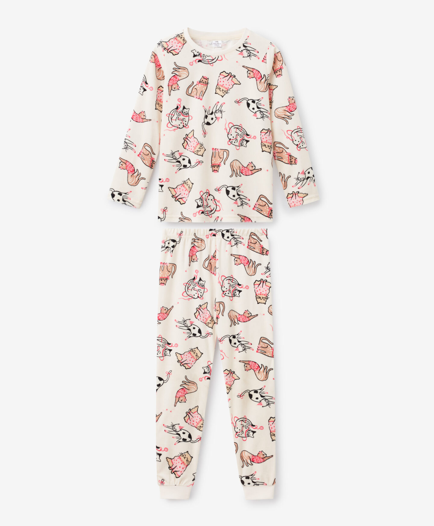 Este pijama infantil de terciopelo con estampado de gatitos es la prenda favorita de los más pequeños. Tiene un tejido suave y agradable al tacto, por lo que ofrece comodidad y libertad de movimiento. Los divertidos estampados de gatos hacen que todos quieran ponérselo antes de dormir. Aporta calor y confort para las noches más frescas.