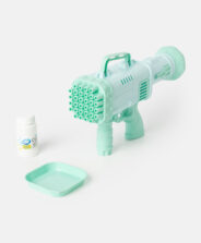 Pistola de agua azul para crear miles de pompas con un solo botón. Cuenta con 32 orificios que generan burbujas de forma continua. Es ligera, ergonómica y perfecta para exteriores. Incluye líquido para pompas.