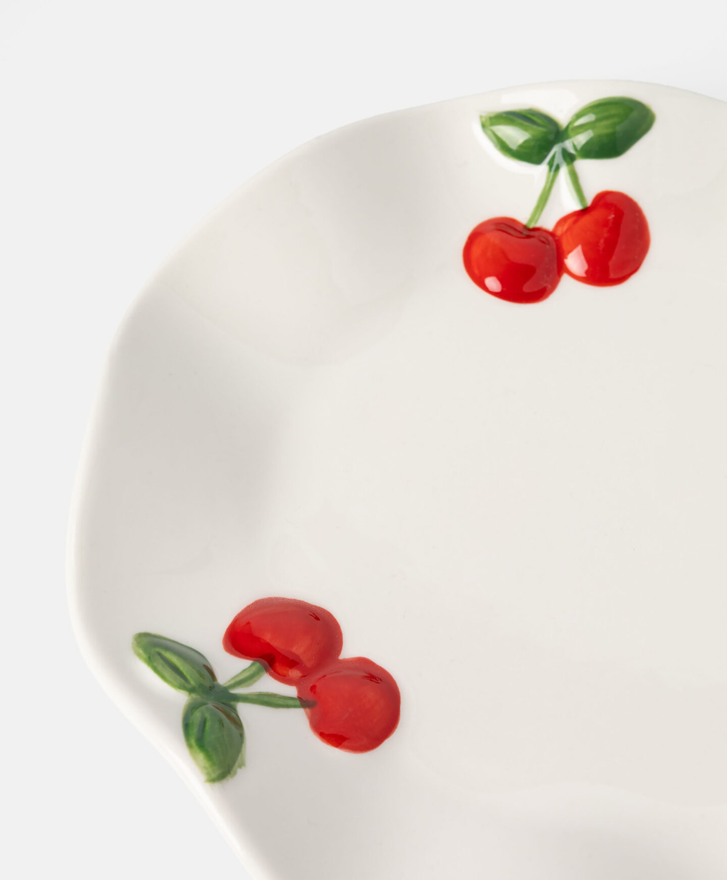 El plato de porcelana con estampado de cerezas es ideal para dar un toque especial a cualquier comida. Su tamaño lo hace muy versátil. El diseño ondulado y frutal lo convierte en una pieza protagonista.