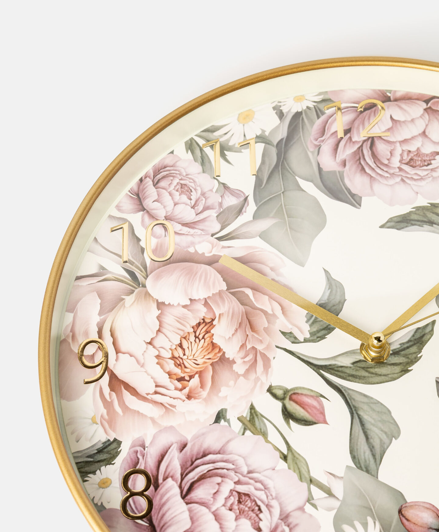 El reloj de pared con estampado floral combina diseño y funcionalidad. El estampado de peonías en flor lo llena todo de color y un ambiente primaveral. El marco y las agujas en color dorado aportan un acabado elegante. Es una buena opción para quienes buscan accesorios decorativos con personalidad.
