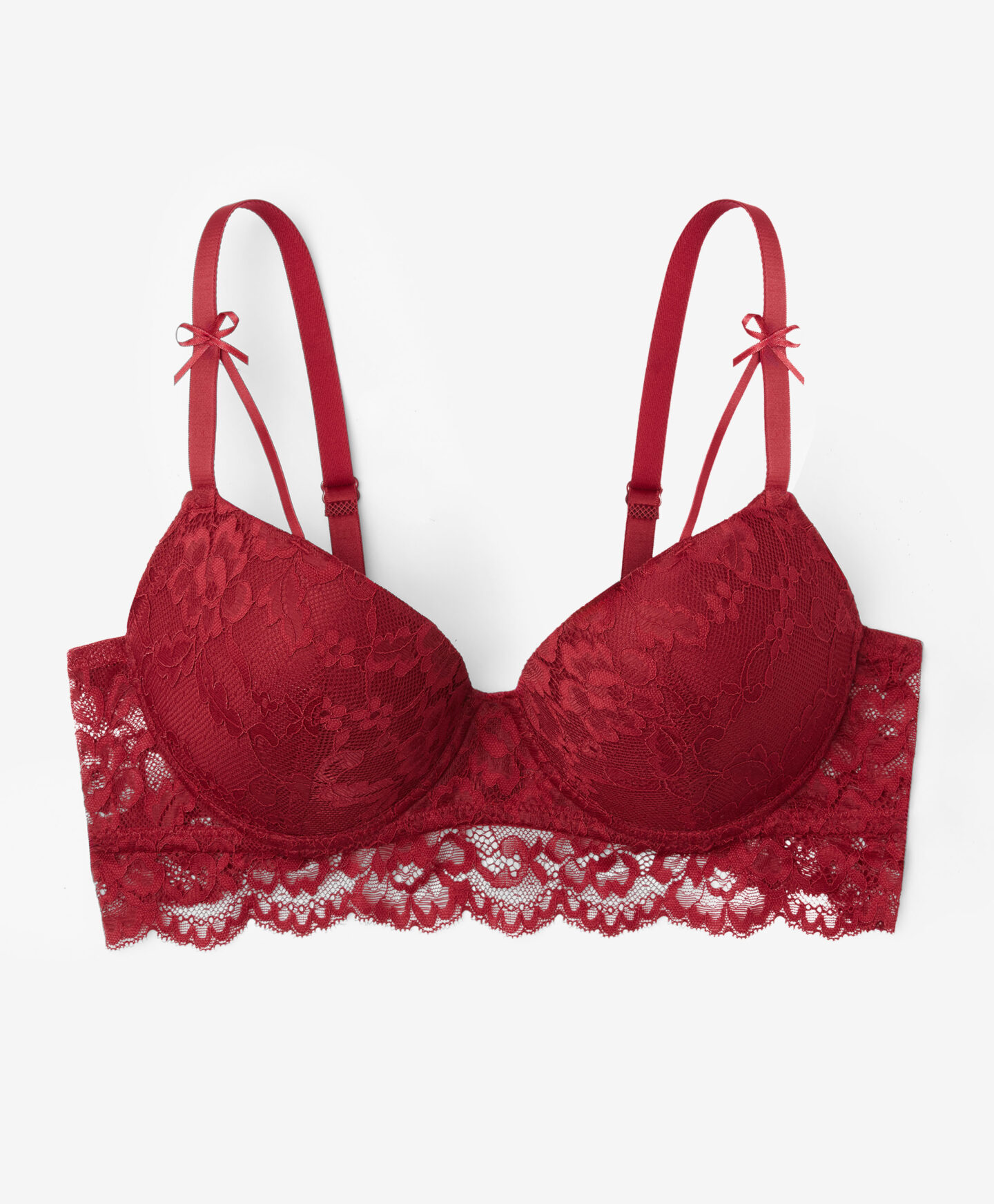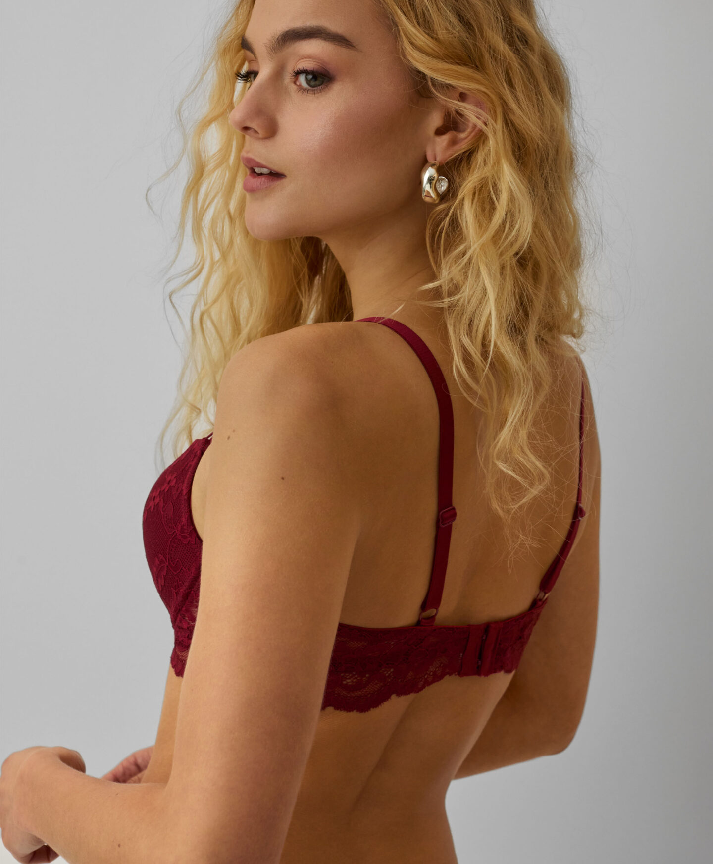 Sujetador super push-up que realza el pecho y aporta un encanto único. El estampado de rosas burdeos le da un aire romántico, ideal como regalo especial. Su tejido suave garantiza comodidad durante todo el día. Braguita a juego disponible en la colección.