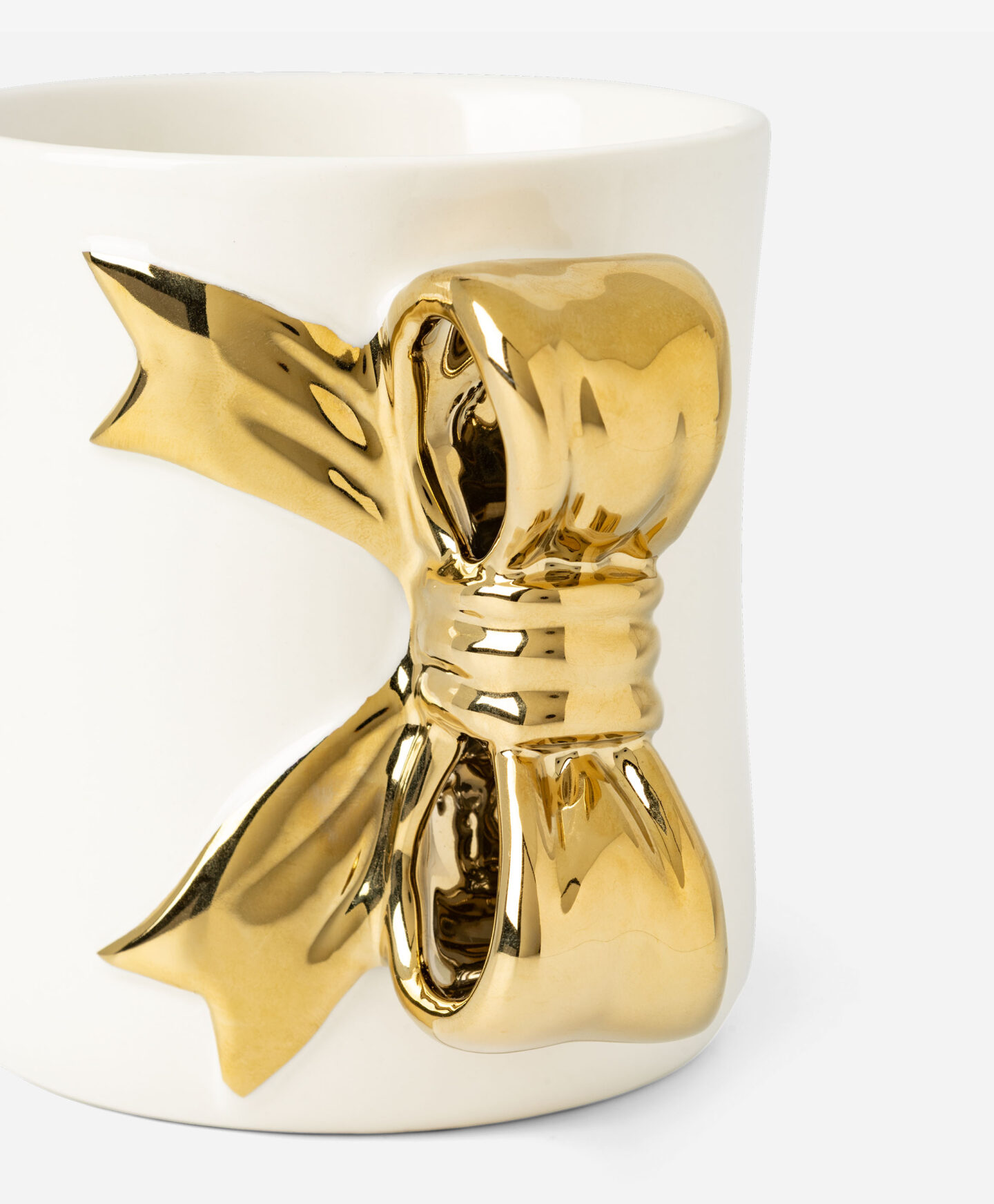 La taza con asa dorada en forma de lazo destaca por su diseño original. Es perfecta para servir café, té u otras bebidas, aportando un toque especial a la mesa. Ideal para completar tu vajilla o como regalo para alguien especial.