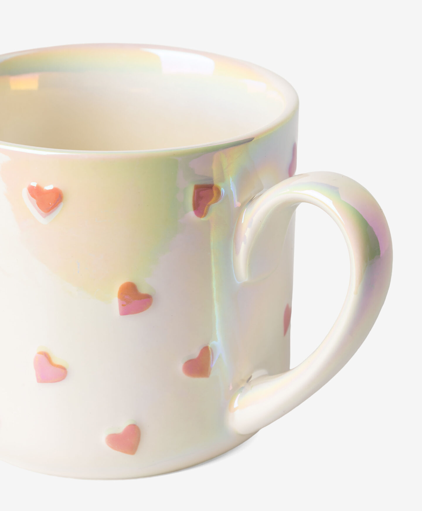 Taza blanca con corazones y efecto holo que destaca en cualquier mesa. Su diseño romántico la hace ideal para San Valentín o como regalo especial. Fabricada en porcelana resistente y fácil de mantener. Disponible en dos colores.