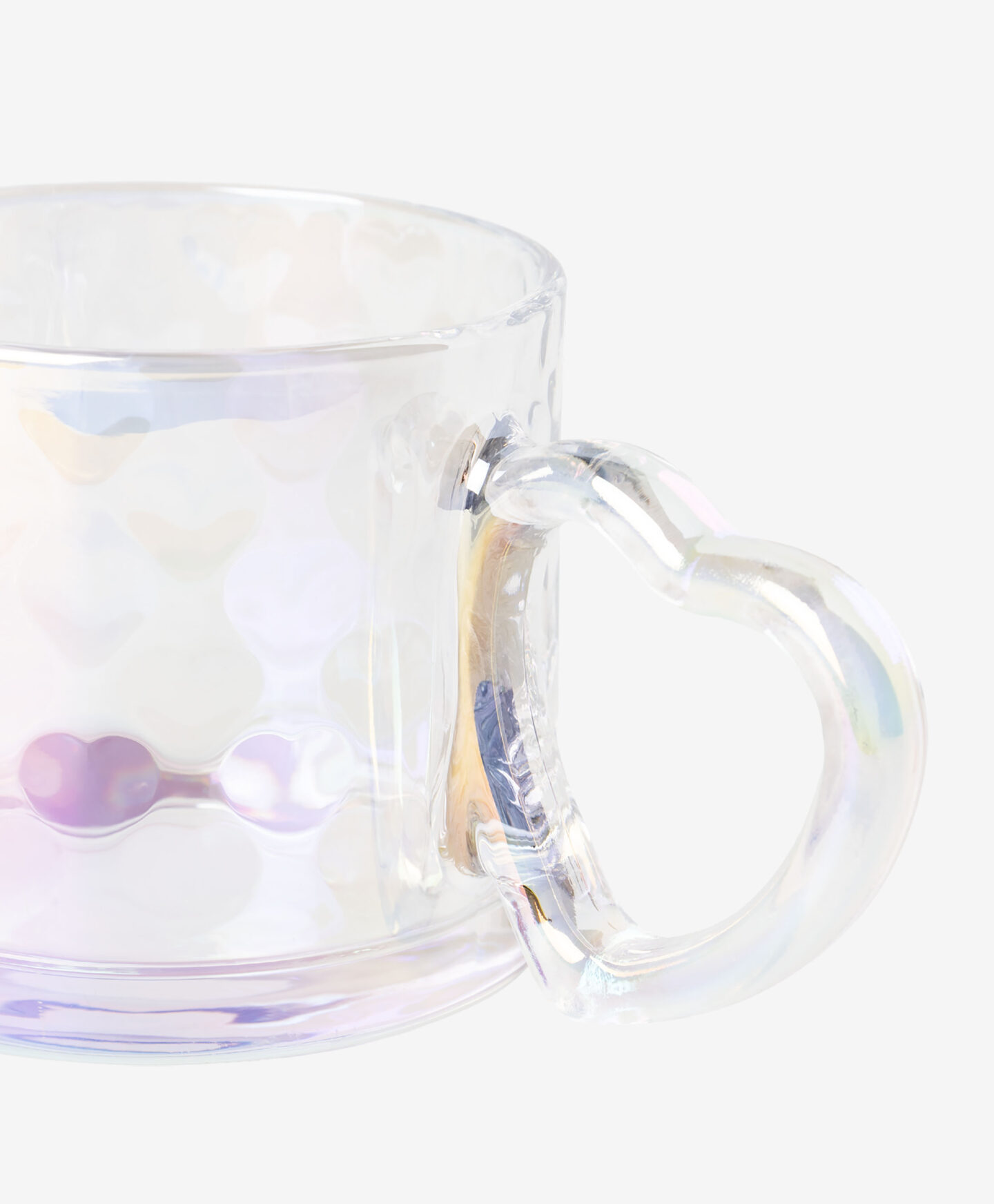 Taza de cristal con asa en forma de corazón, ideal para café o té. El efecto holo le da un toque original y decorativo. El diseño del asa aporta un aire romántico a cada bebida.