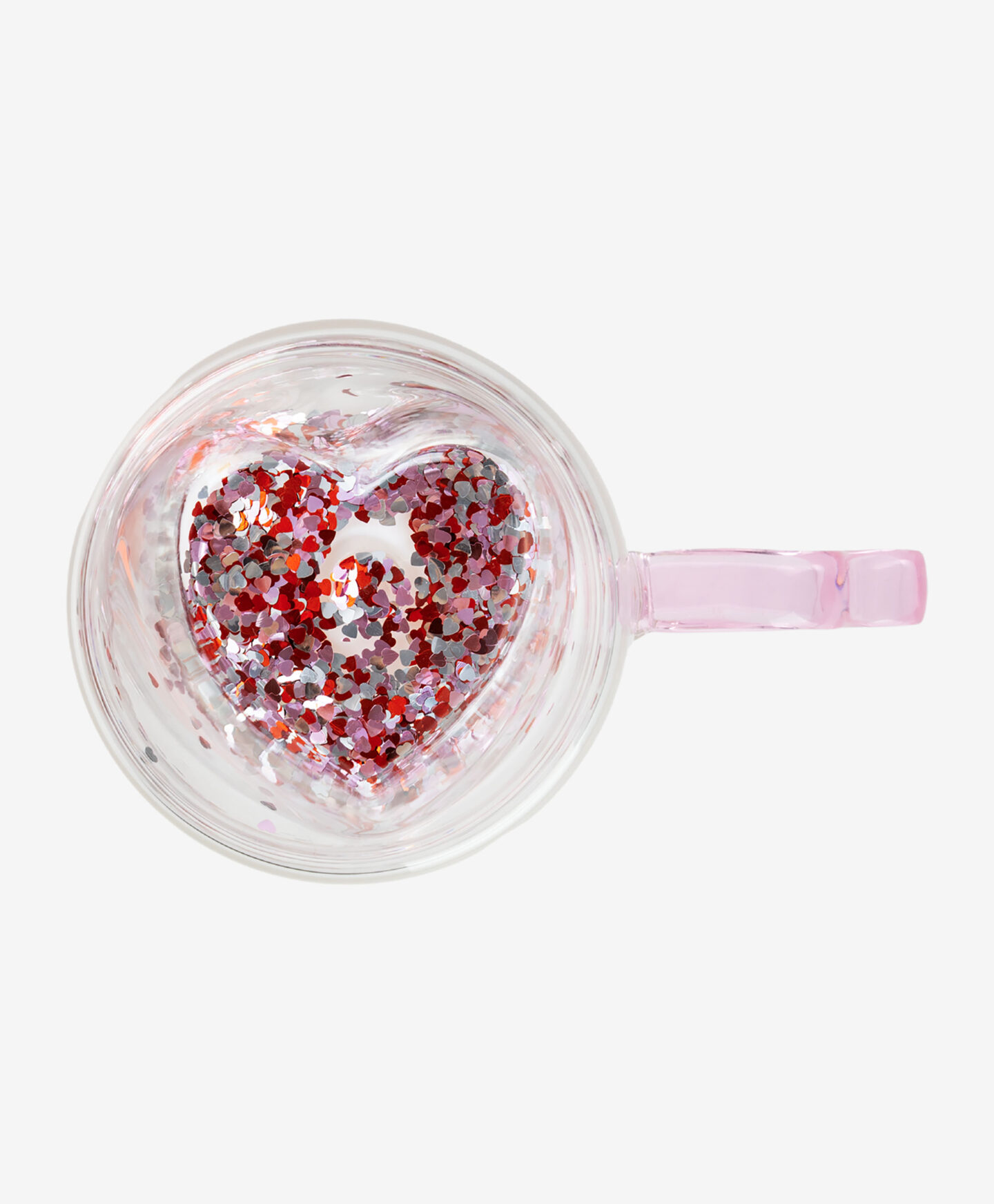 Taza de cristal de borosilicato con asa en forma de corazón y doble pared rellena de confeti brillante. Perfecta para café o té y como regalo original. Fabricada en cristal resistente, es apta para el uso diario y fácil de mantener.