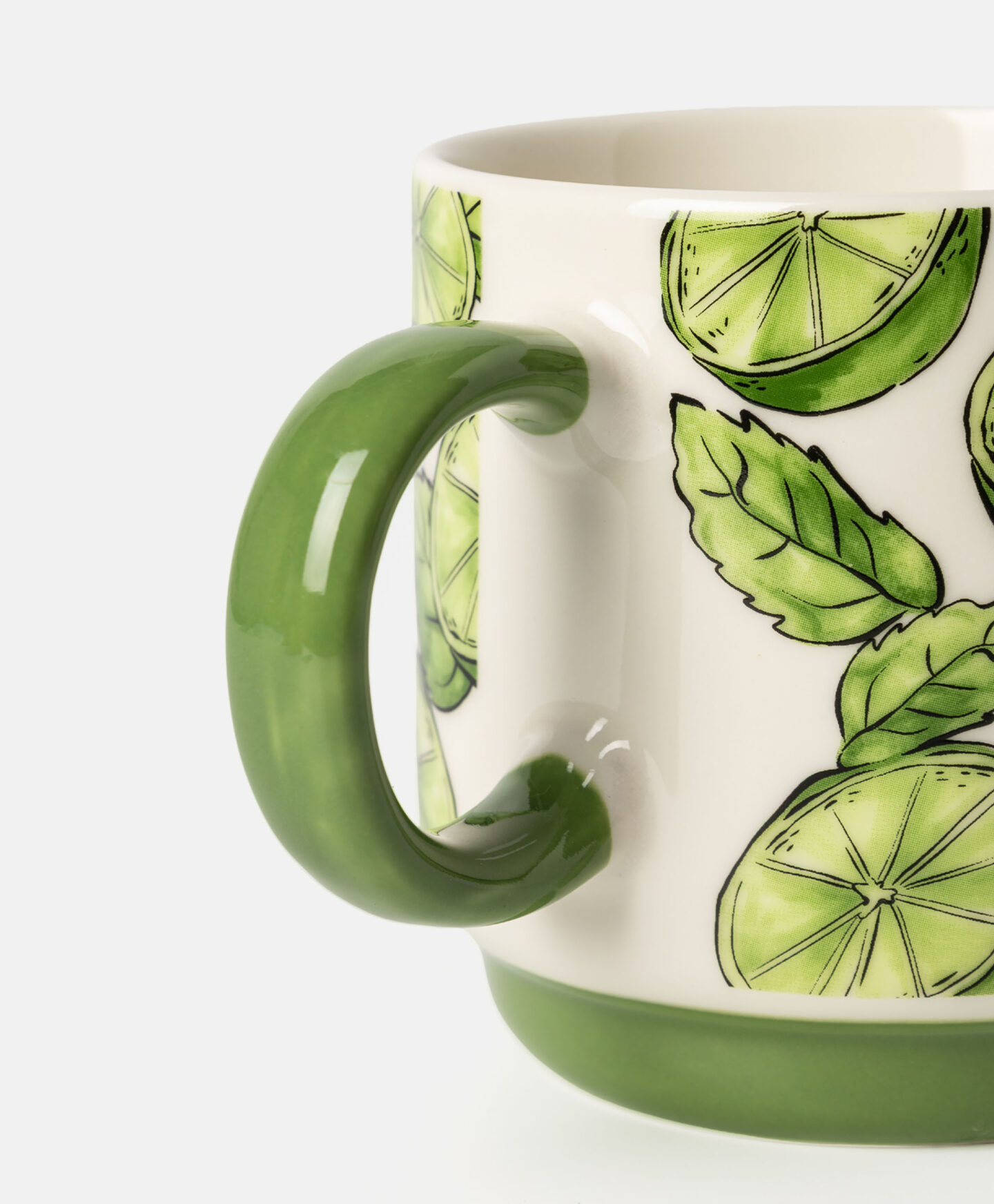 La taza de porcelana con estampado de limas destaca por su diseño fresco y lleno de color. Es perfecta para disfrutar de café, té o cacao. La porcelana es resistente y fácil de limpiar. Está disponible en dos diseños diferentes.