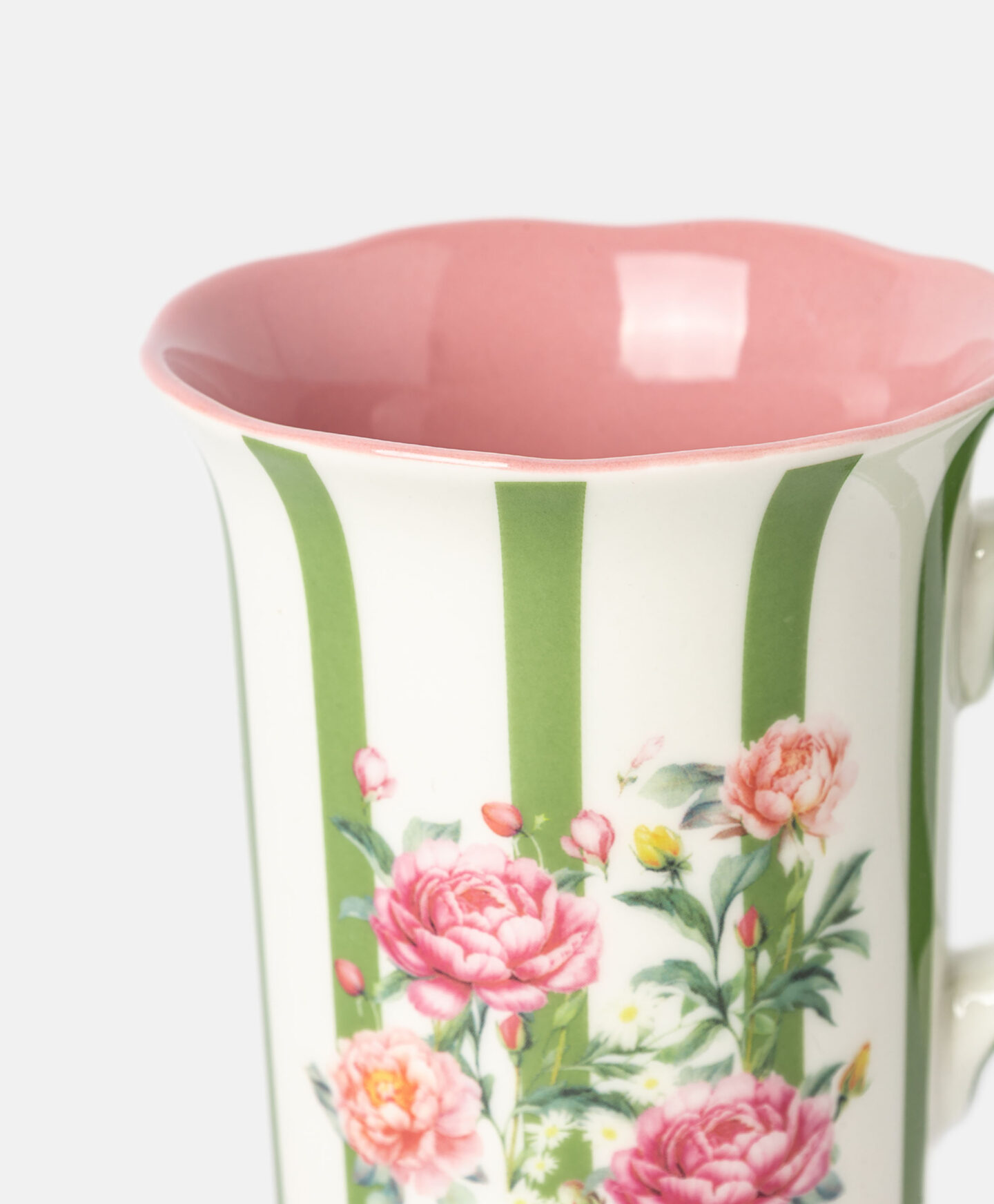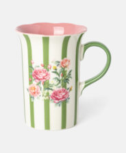 La taza verde con rayas aporta color a cada momento con la bebida favorita. El estampado floral introduce un aire primaveral y hace más especial cada sorbo. Funciona para café con leche, té o cacao. Es una buena idea para regalar. Está disponible en dos diseños.