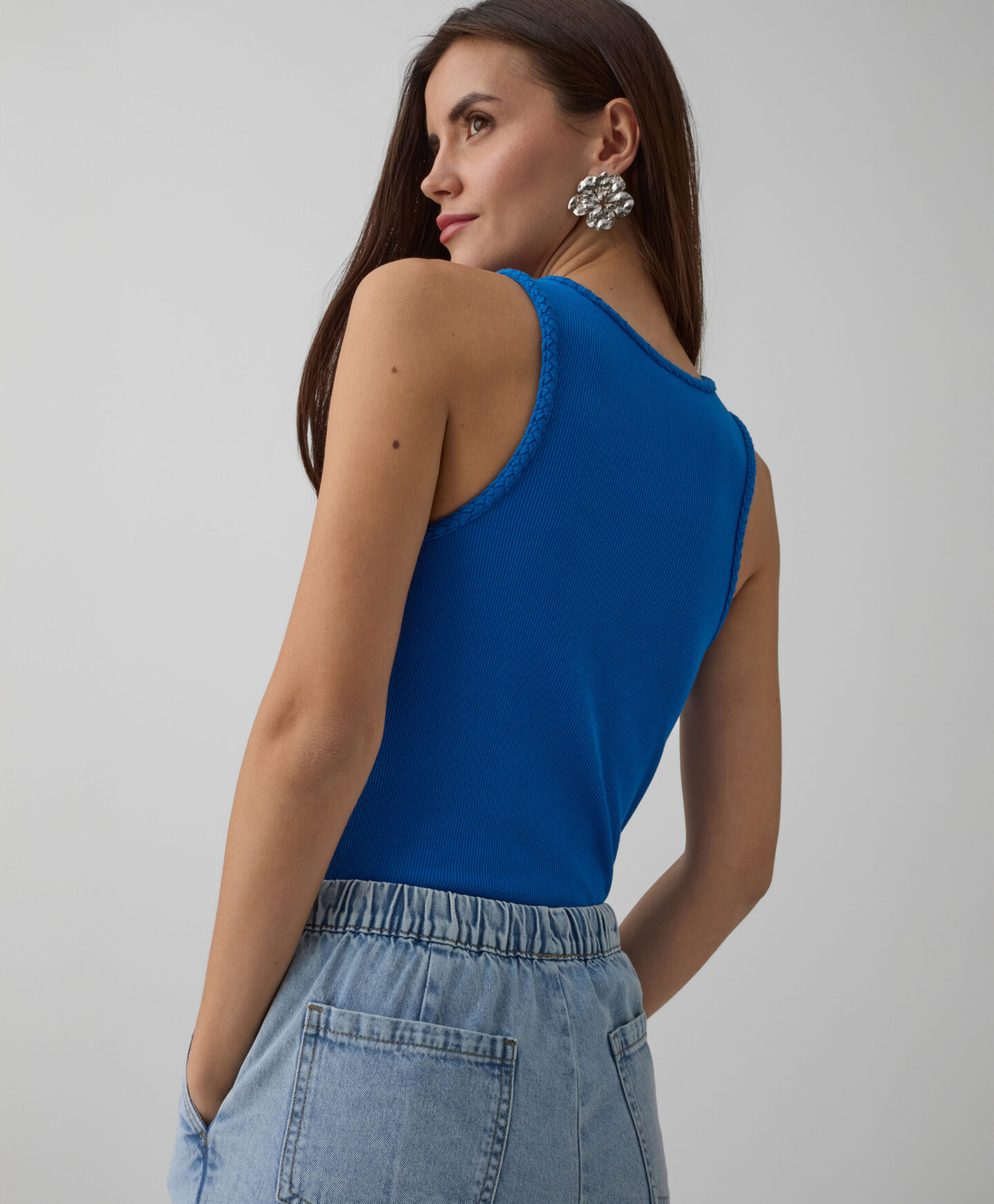 El top blanco es la base de muchos looks con estilo. Su diseño atemporal combina fácilmente con pantalones o faldas. El tejido suave y transpirable garantiza comodidad durante todo el día, en cualquier temporada. Disponible en dos colores.
