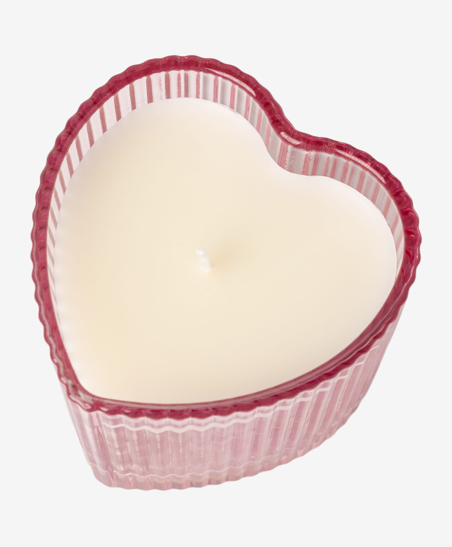 Vela aromática con forma de corazón en vaso de cristal. El diseño con relieve refleja la luz de forma elegante y aporta calidez al espacio. Ideal como regalo para ocasiones especiales.