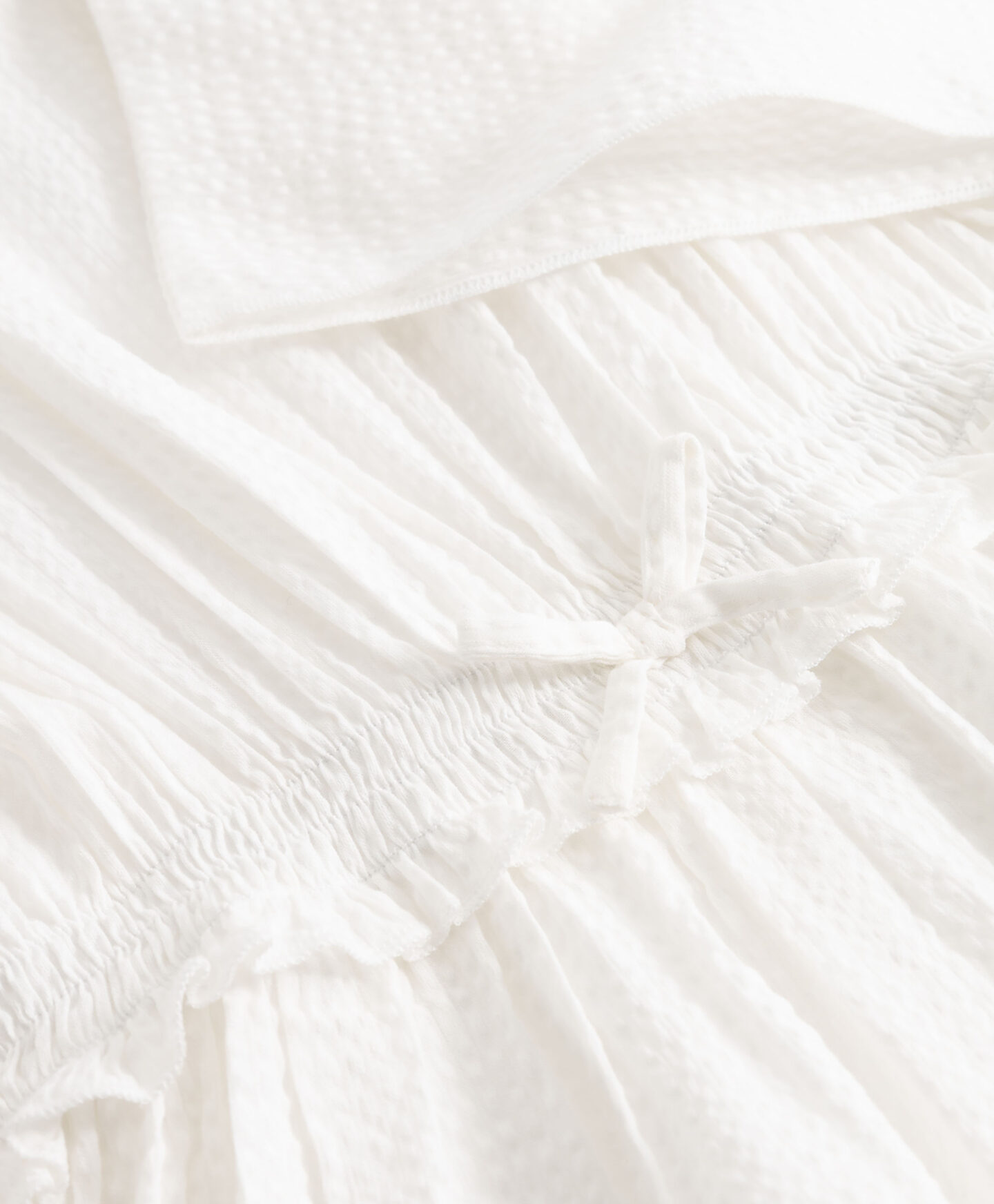 El vestido 100% algodón combina comodidad y un toque elegante para el día a día. El tejido natural y suave permite que la piel respire durante todo el día. El corte ligeramente acampanado facilita el movimiento al correr, saltar o jugar. Los tonos claros y el aplique decorativo aportan personalidad al diseño.