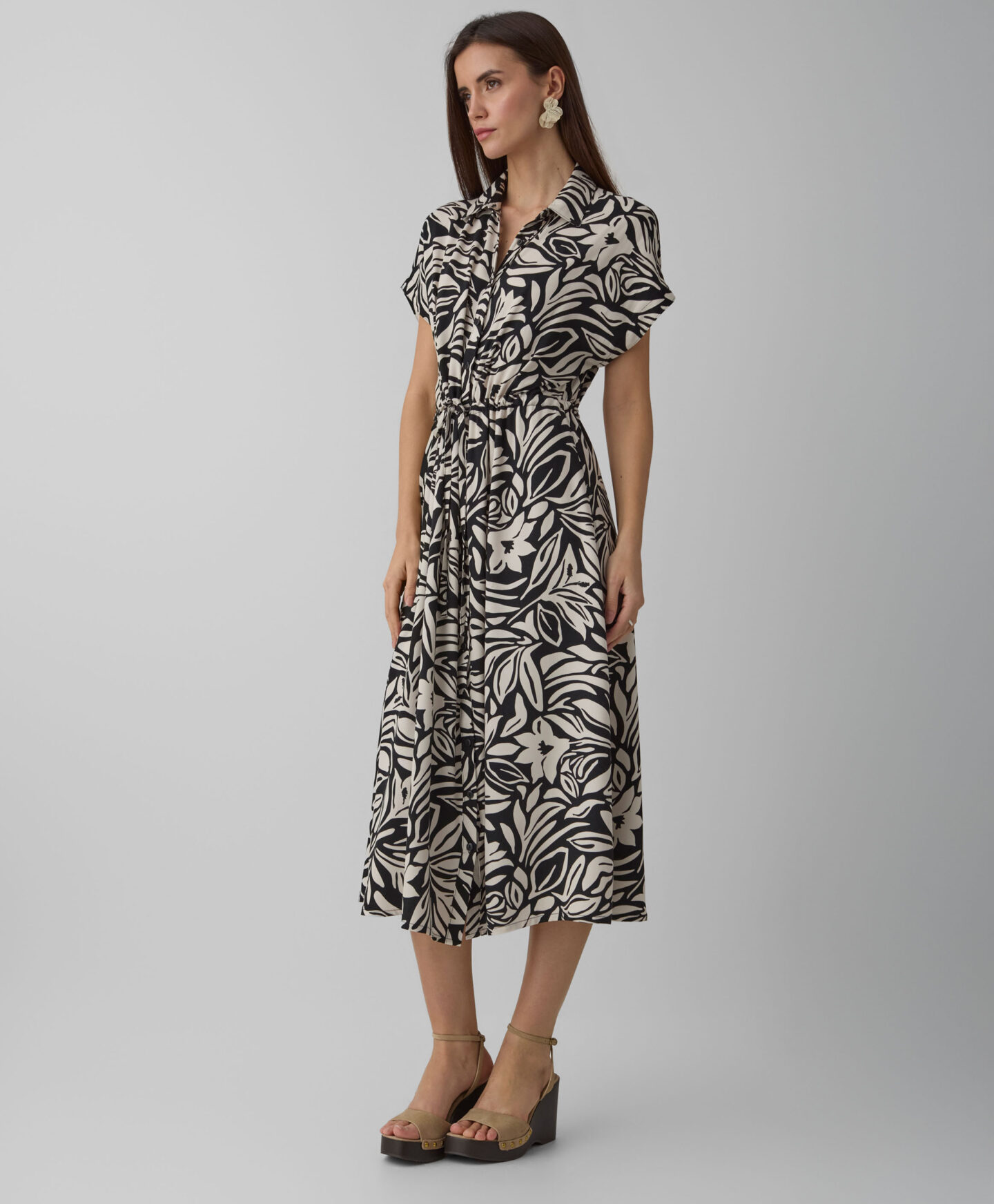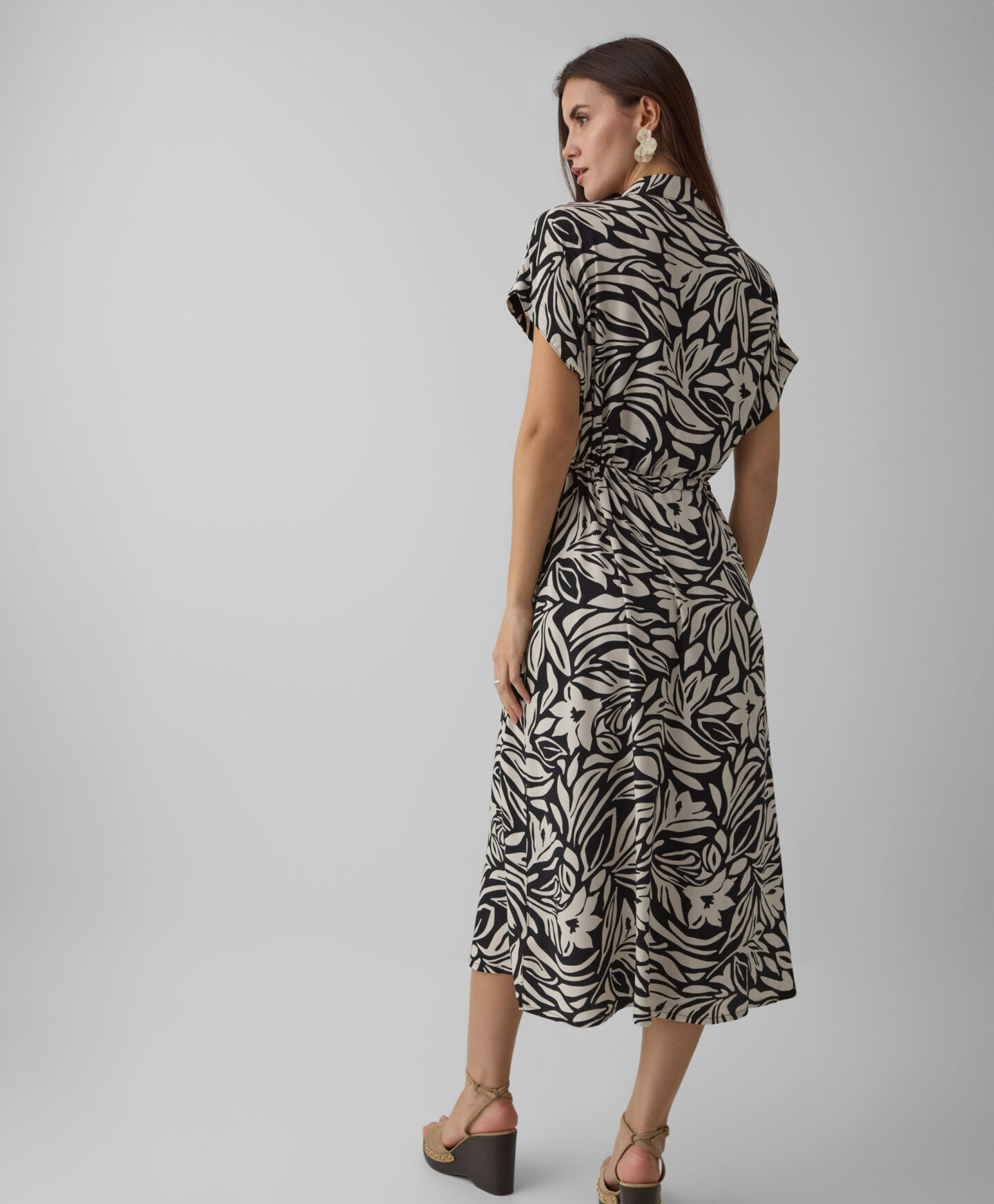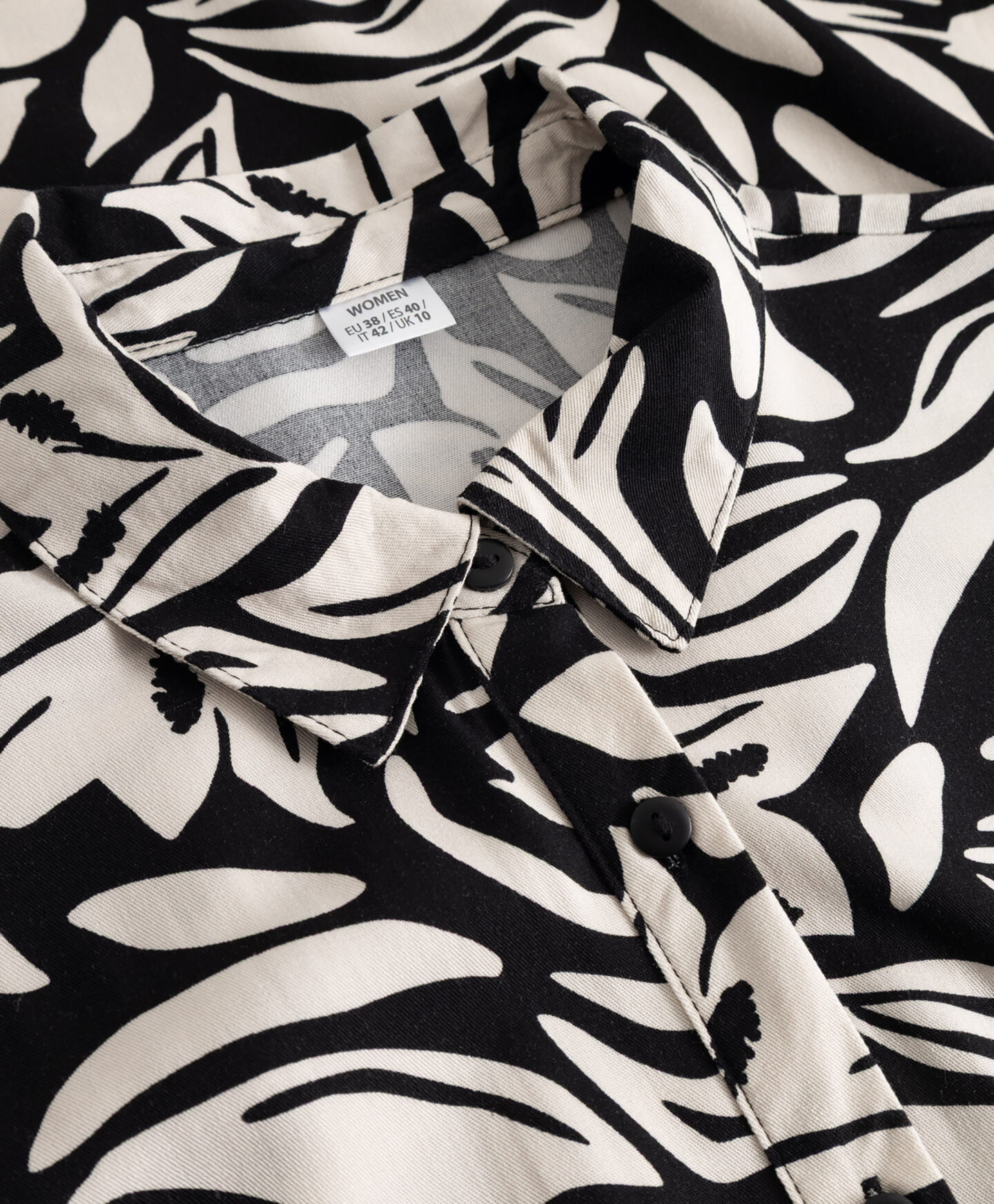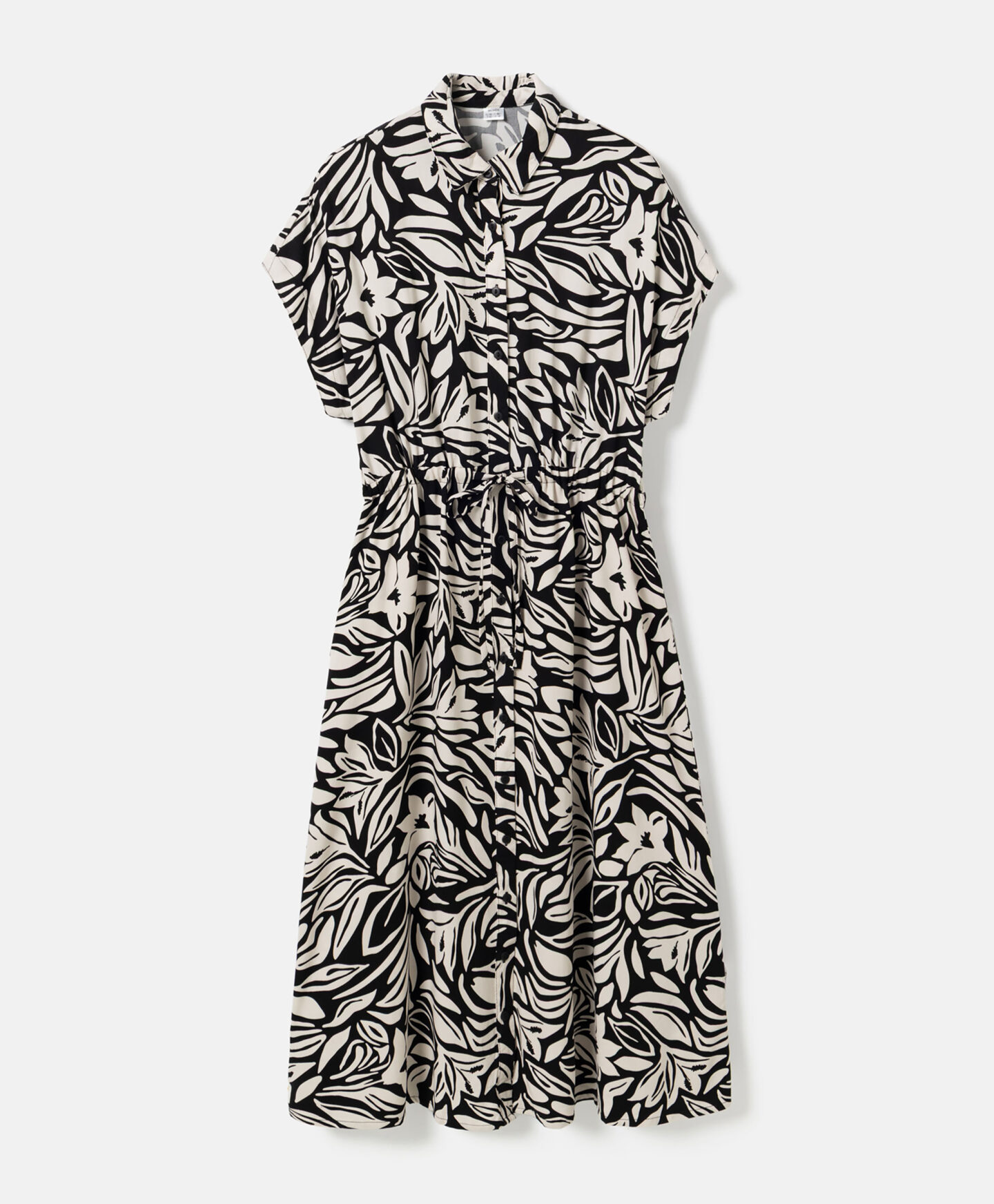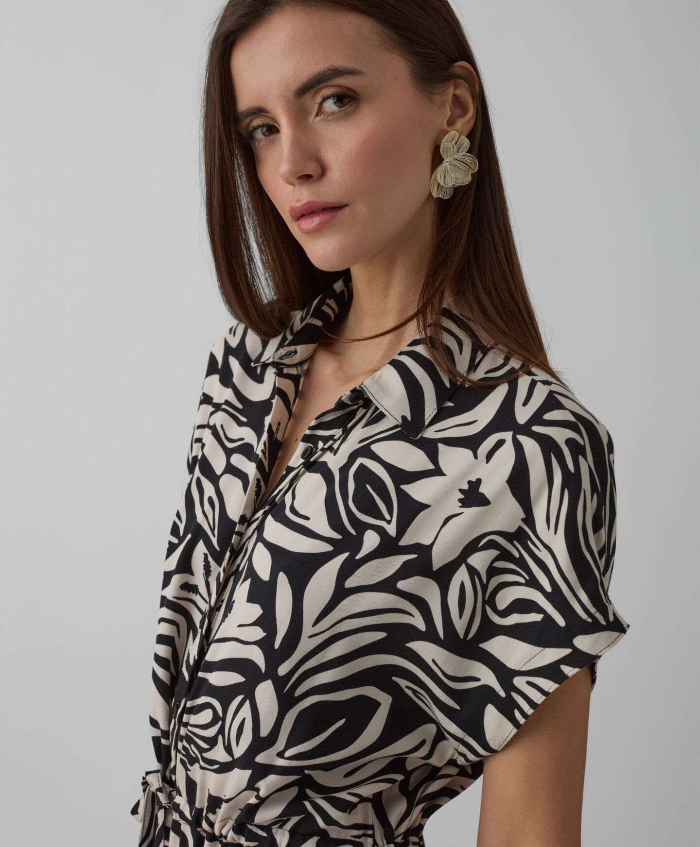 El vestido 100% viscosa con estampado destaca por su ligereza y suavidad. Su tejido fluido garantiza comodidad en cualquier época del año. La manga corta es perfecta para entretiempo y su corte con lazada se adapta fácilmente a diferentes siluetas.