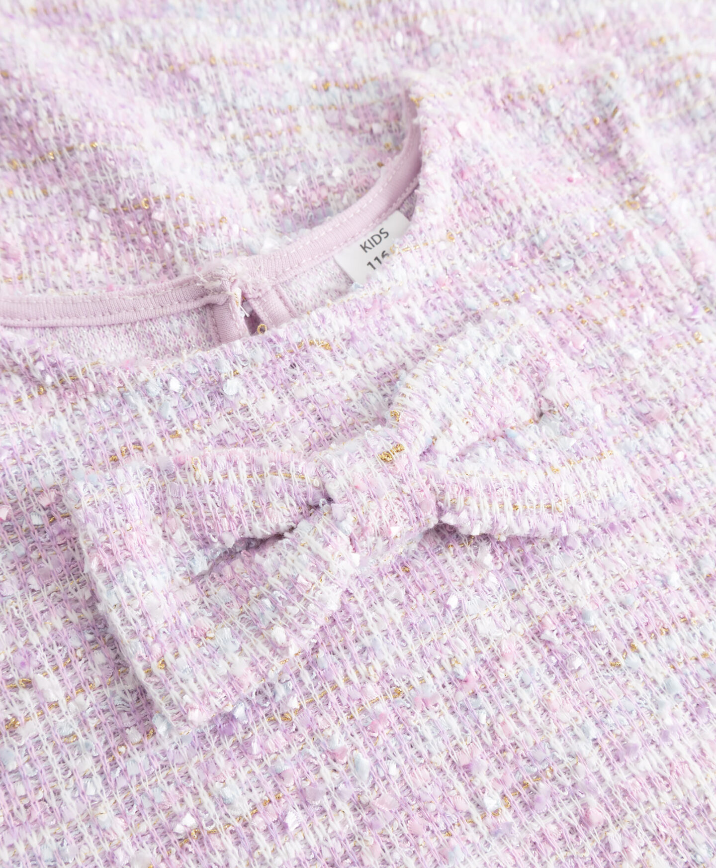 El vestido con lazo en el cuello destaca por su elegancia atemporal. El corte recto y sencillo permite moverse con comodidad. El diseño sin mangas ofrece muchas opciones de estilo. Puede combinarse con una blusa o una camiseta debajo. El tejido bouclé con hilo dorado aporta textura y un efecto tridimensional. Es perfecto para ocasiones especiales.