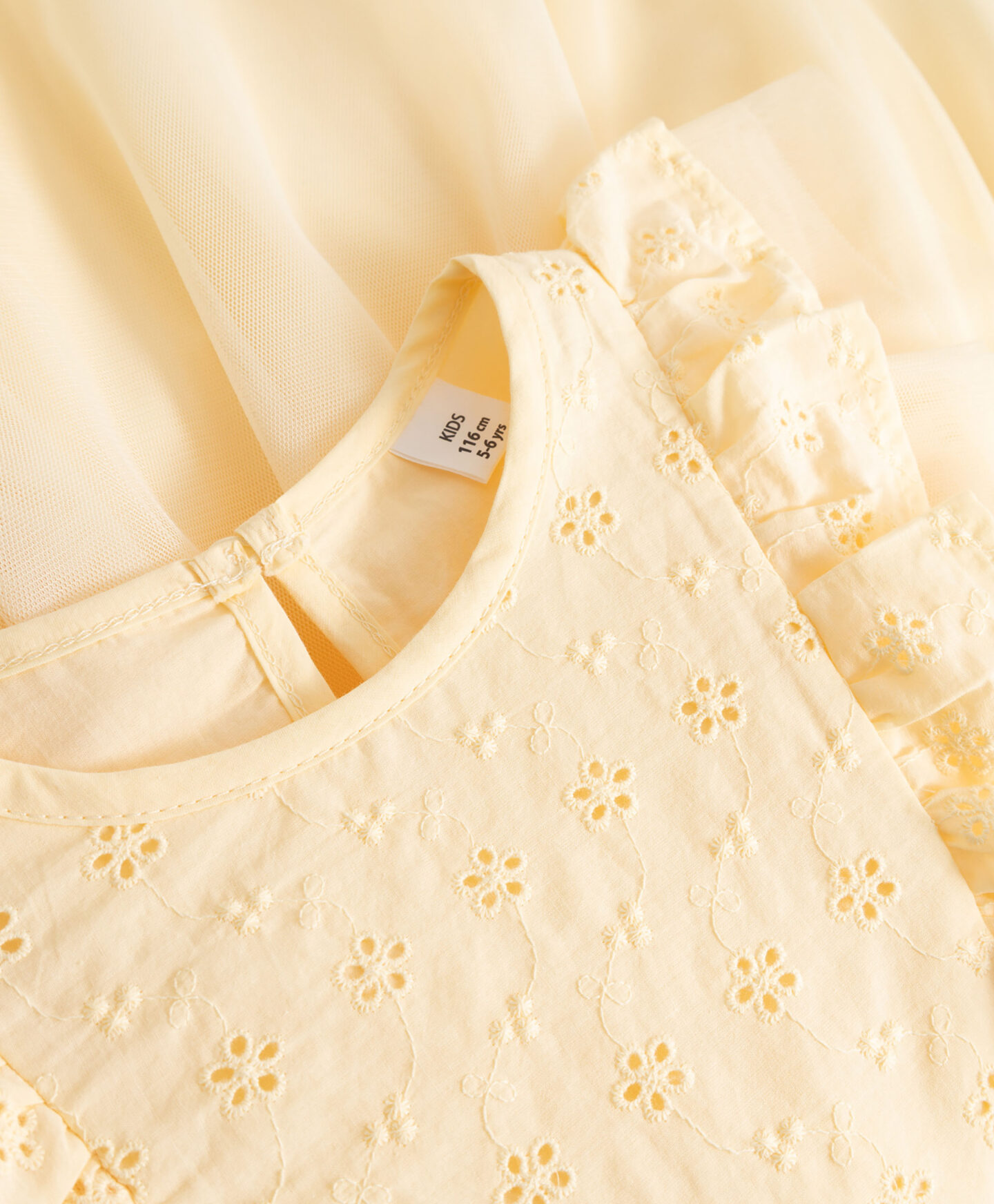 El vestido en tono amarillo pastel aporta un estilo luminoso y alegre. El cuerpo con delicados detalles florales calados añade elegancia. Las mangas de tul con forma de mariposa crean un efecto ligero. La falda de tul aporta movimiento y suavidad al look. Es una opción perfecta para días cálidos y soleados.