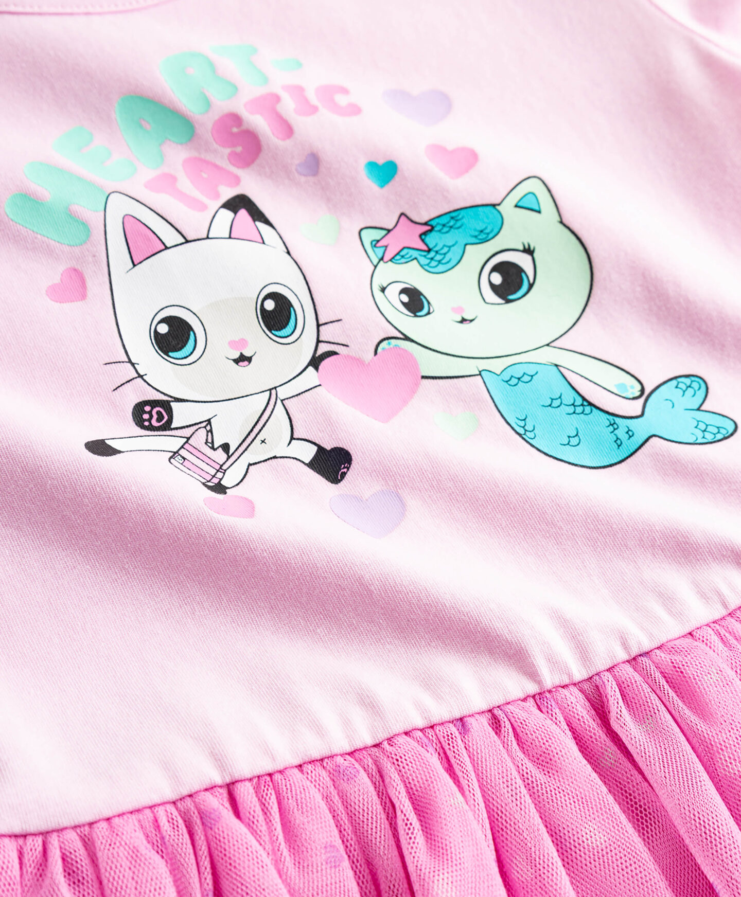 El vestido de Gabby’s Dollhouse 100% algodón es una opción encantadora con un toque de fantasía. La parte inferior de tul aporta ligereza y un aire mágico. El estampado de los personajes en el frontal lo hace destacar. Es perfecto como look completo para el día a día o momentos especiales.